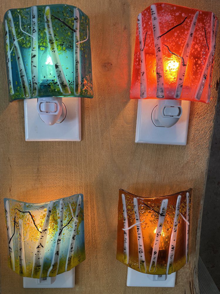 Tags: aspen trees, cabin gift, Colorado gift idea, fused glass, hand painted glass, home decor, local artist, new to colorado gift, night light