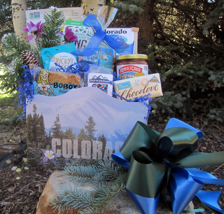 One of our bestselling gifts! A beautiful photo box displays the grandeur of Colorado and is enhanced with pine branches! The box has a summer mountain scene on one side, a winter scene on the other side and fall and spring on the sides. This gift contains non-GMO tortilla chips, Rocky Mountain Salsa, Altitude Snacks Non-GMO Spring snack mix, Non-GMO Aspen Toffee popcorn, Slowz all-natural blueberry fruit candy, a BoBo’s original oat bar, rock candy (jellybeans shaped like rocks), and a peppermint dark chocolate Chocolove bar. Gift size 12″ X 7 X 22″.