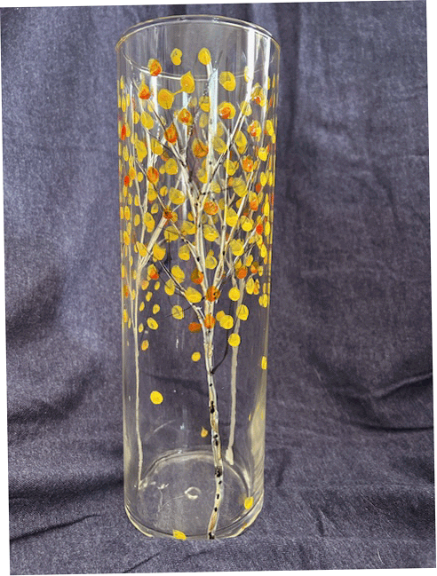 This beautiful, cylindrical glass vase is hand-painted with aspen leaves in each season. This is trees in fall. The artist has loves to paint scenes from nature. Each product unique, some variations to be expected. A beautiful gift for any occasion. 10 1/2 by 3 1/2 wide. Fort Collins Artist